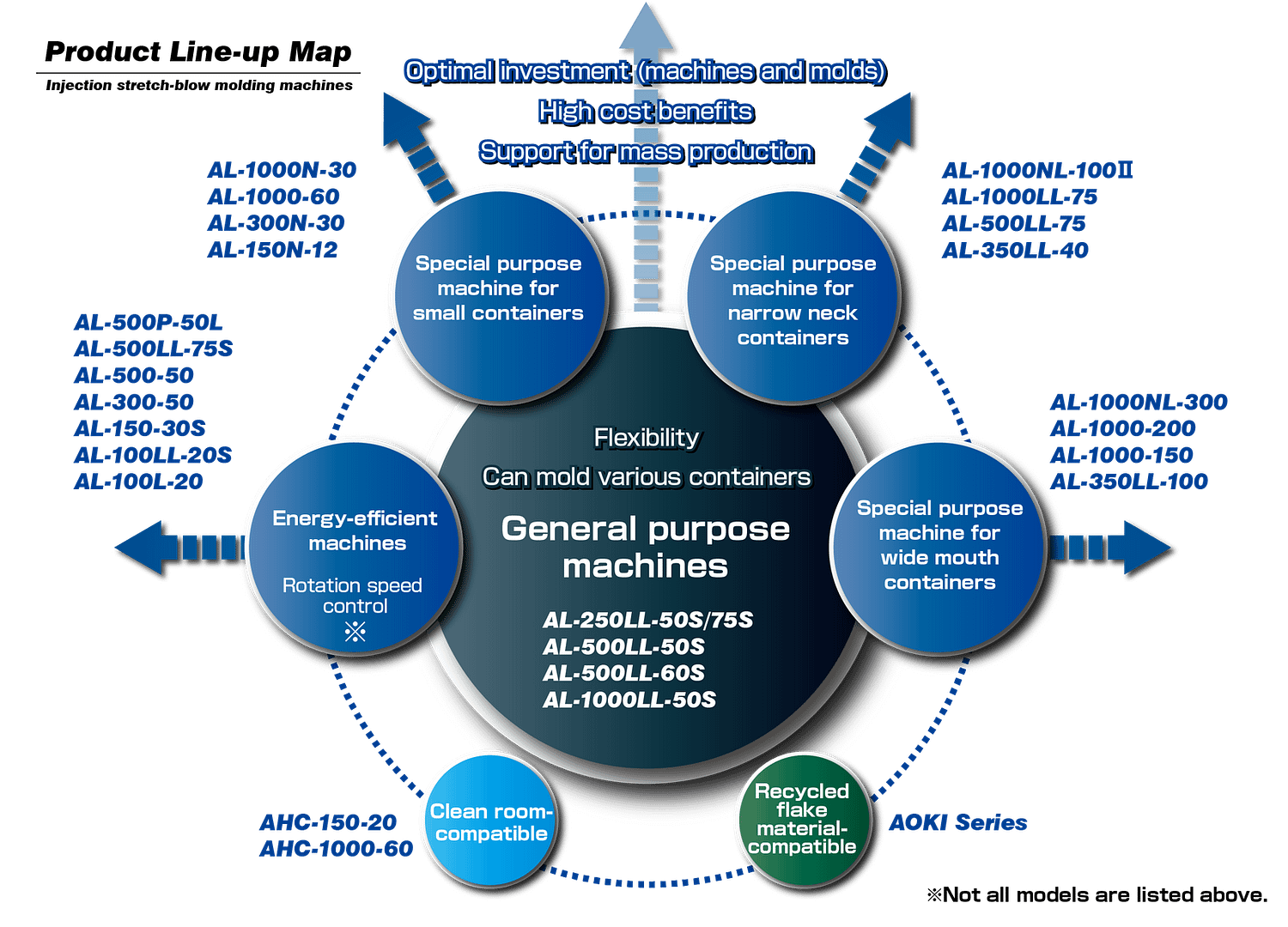 Capable of molding a wide variety of containers from small containers to wide mouth containers, our general purpose machines deliver multifaceted value and flexibility to accommodate changes in your container business. The biggest feature of our AL series is, however, special purpose machines designed to deliver maximum business benefits. Whatever your needs, we can support you by optimizing container design, reducing material use, shortening molding cycles, supporting mass production, and more.
